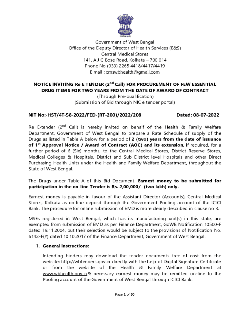 Government of West Bengal Office of the Deputy Director of Health Services (E&S) Central Medical Stores 141, A J C Bose Road, Kolkata 700 014 Phone No (033) 2265 4418/4417/4419 E mail : cmswbhealth@gmail.com