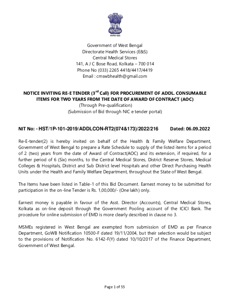 Government of West Bengal Directorate Health Services (E&S) Central Medical Stores 141, A J C Bose Road, Kolkata 700 014 Phone No (033) 2265 4418/4417/4419 Email : cmswbhealth@gmail.com NOTICE INVITING