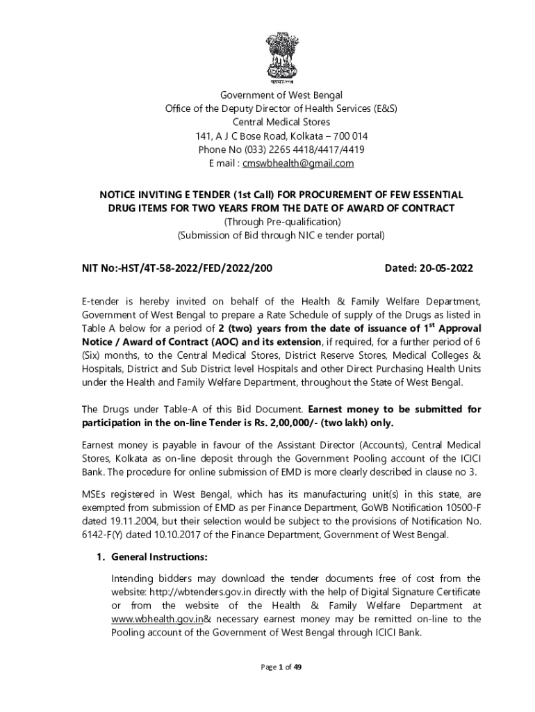 Government of West Bengal Office of the Deputy Director of Health Services (E&S) Central Medical Stores 141, A J C Bose Road, Kolkata 700 014 Phone No (033) 2265 4418/4417/4419 E mail : cmswbhealth@gmail.com