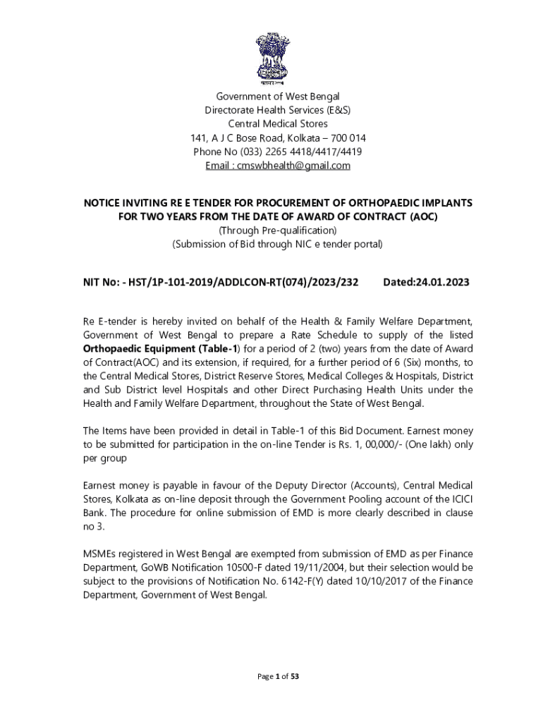 Get the free NOTICE INVITING RE E TENDER FOR PROCUREMENT OF ORTHOPAEDIC IMPLANTS