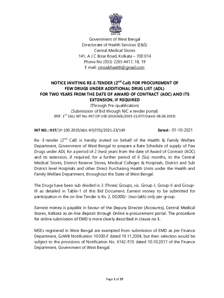 Government of West Bengal Directorate of Health Services (E&S) Central Medical Stores 141, A J C Bose Road, Kolkata 700 014 Phone No (033) 2265 4417, 18, 19 E mail: cmswbhealth@gmail.com NOTICE INVITING