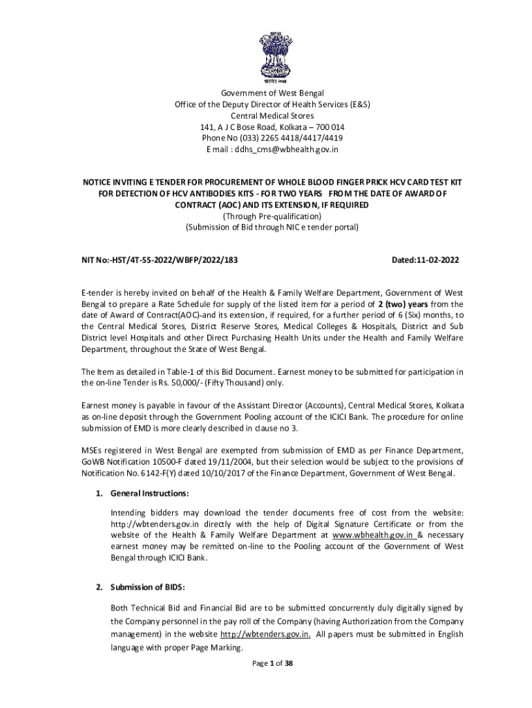 Government of West Bengal Office of the Deputy Director of Health Services (E&S) Central Medical Stores 141, A J C Bose Road, Kolkata 700 014 Phone No (033) 2265 4418/4417/4419 E mail : ddhs_cms@wbhealth.gov.in