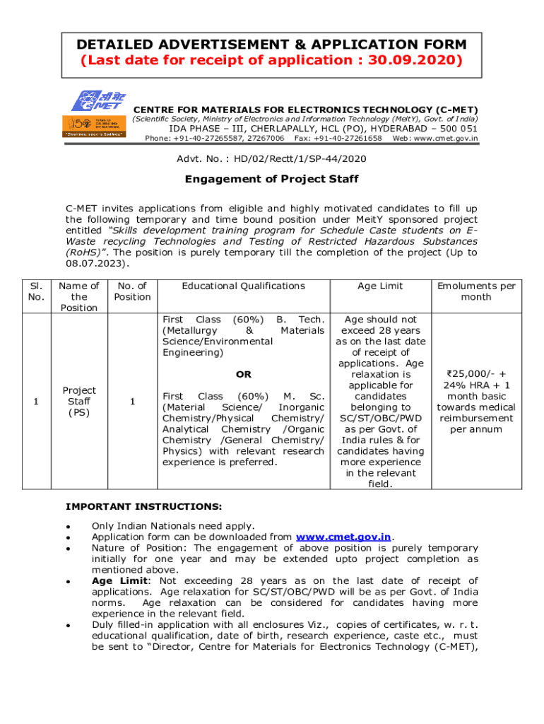 DETAILED ADVERTISEMENT & APPLICATION FORM (Last date for receipt of application : 30.09.2020)Center FOR MATERIALS FOR ELECTRONICS TECHNOLOGY (MET) (Scientific Society, Ministry of Electronics and