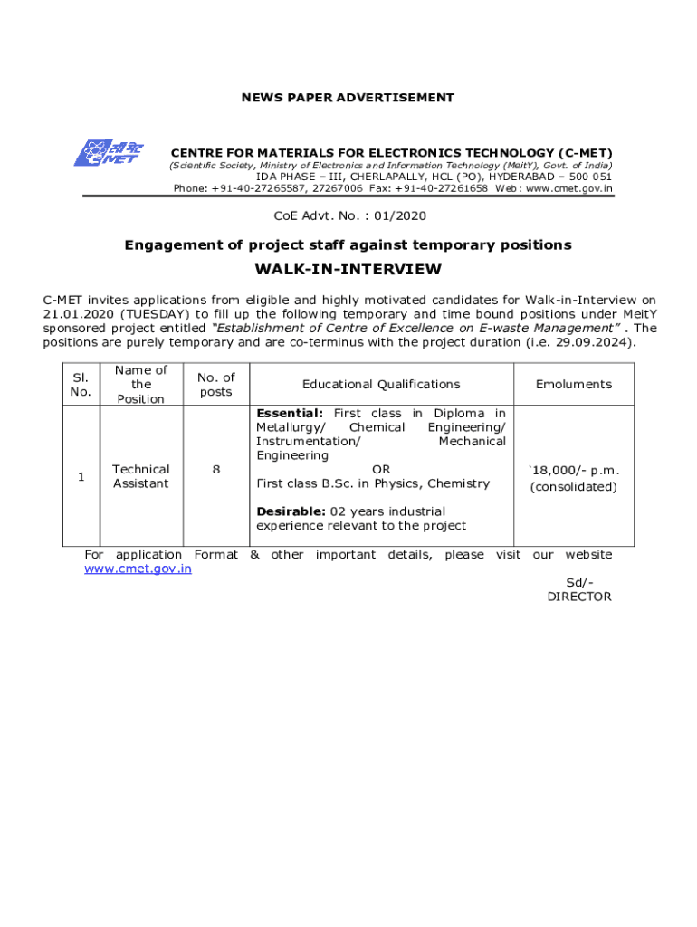 Newspaper ADVERTISEMENTCENTRE FOR MATERIALS FOR ELECTRONICS TECHNOLOGY (MET)