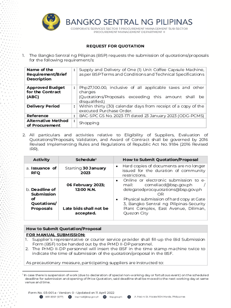 CORPORATE SERVICES SECTOR I PROCUREMENT MANAGEMENT SUBSECTION PROCUREMENT MANAGEMENT DEPARTMENT REQUEST FOR QUOTATION 1. The Bangkok Central NG Filipinas (BSP) requests the submission of quotations/proposals