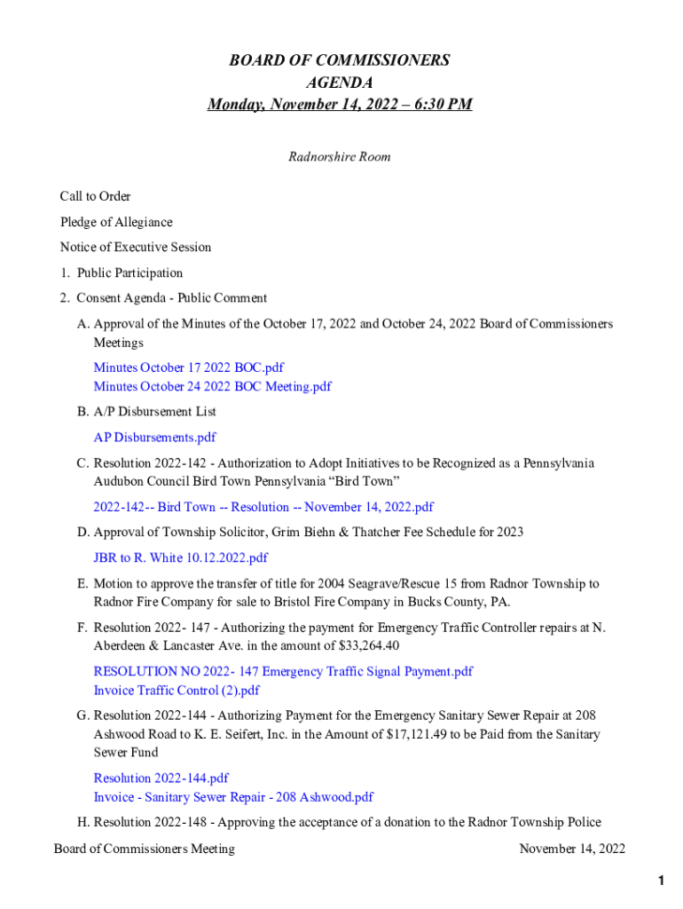BOARD OF COMMISSIONERS AGENDA Monday, November 14, 2022 6:30 PM Radnorshire Room Call to Order Pledge of Allegiance Notice of Executive Session 1. Public Participation 2. Consent Agenda Public Comment