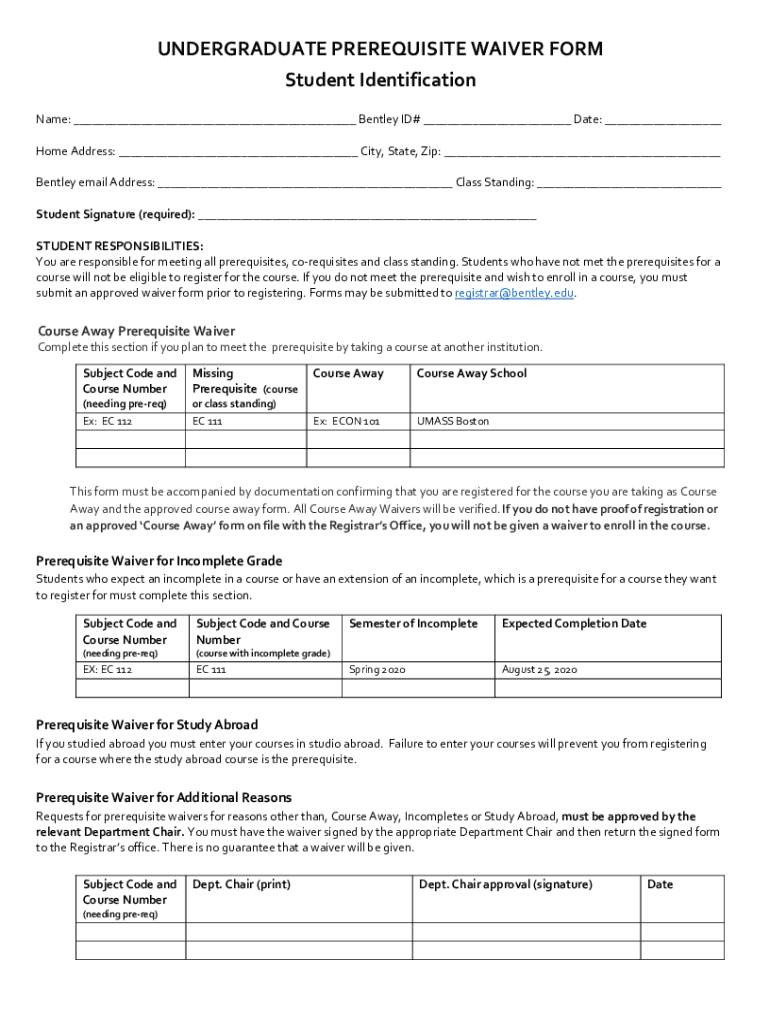 UNDERGRADUATE PREREQUISITE WAIVER FORM Student Identification Name: ___ Bentley ID# ___ Date: ___ Home Address: ___ City, State, Zip: ___ Bentley email Address: ___ Class Standing: ___ Student Signature