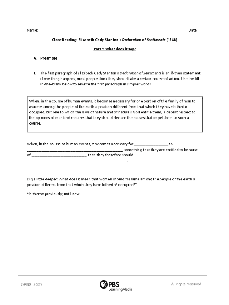 Name:Date: Close Reading: Elizabeth Cady Stanton's Declaration of Sentiments (1848) Part 1: What does it say? A. Preamble1. The first paragraph of Elizabeth Cady Stanton's Declaration of Sentiments