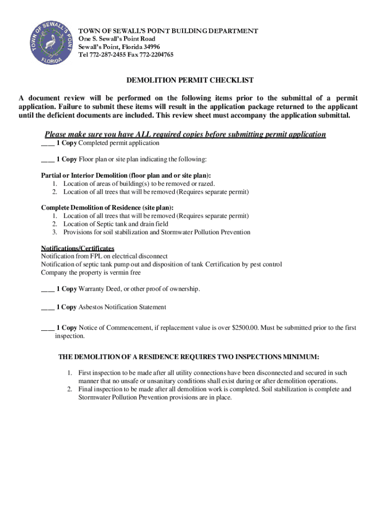 TOWN OF SEAWALLS POINT BUILDING DEPARTMENT One S. Seawalls Point Road Seawalls Point, Florida 34996 Tel 7722872455 Fax 7722204765DEMOLITION PERMIT CHECKLIST A document review will be performed on