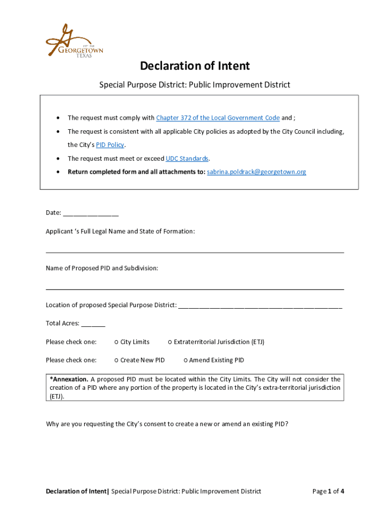 Declaration of Intent Special Purpose District: Public Improvement District The request must comply with Chapter 372 of the Local Government Code and ;The request is consistent with all applicable