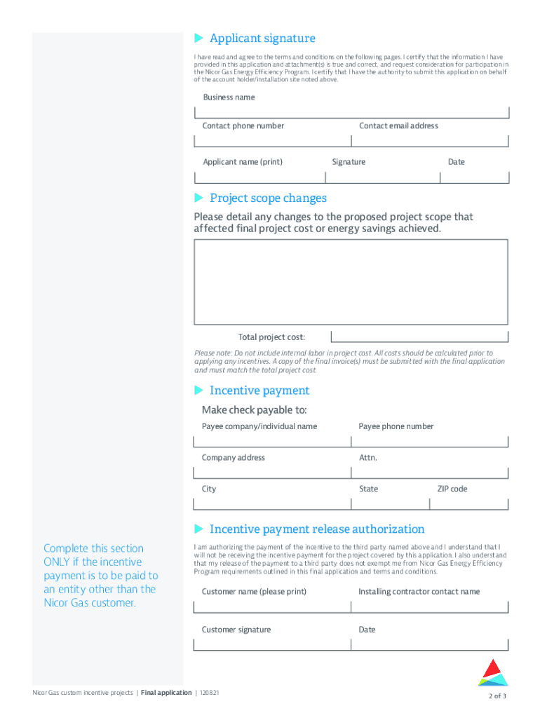 Custom incentive 2022 final applicationComplete page two. All fields are required unless otherwise noted. Please include all required documentation. As an eligible Nicer Gas customer, I certify that