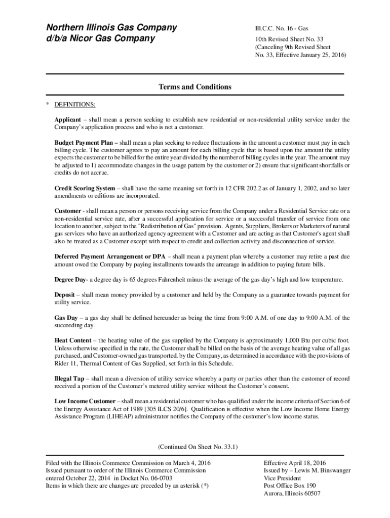Northern Illinois Gas Company d/b/a Nicer Gas Company Ill. C.C. No. 16 Gas 10th Revised Sheet No. 33 (Canceling 9th Revised Sheet No. 33, Effective January 25, 2016)Terms and Conditions * DEFINITIONS: