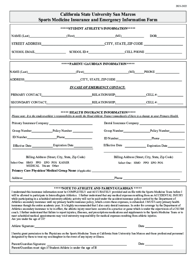 20212022California State University San Marcos Sports Medicine Insurance and Emergency Information Form *****STUDENT ATHLETES INFORMATION***** NAME (Last)(First)(MI)STREET ADDRESSDOBCITY, STATE, ZIP