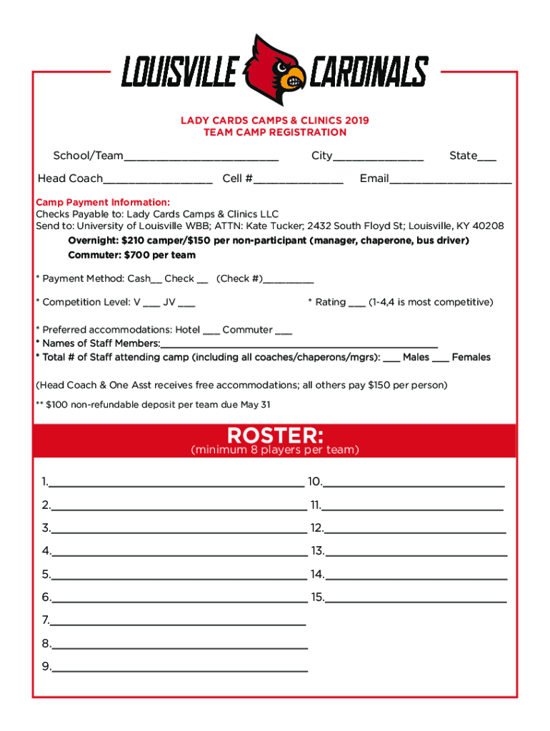 LADY CARDS CAMPS & CLINICS 2019 TEAM CAMP REGISTRATIONSchool/Team___City___Head Coach___ Cell #___State___Email___Camp Payment Information: Checks Payable to: Lady Cards Camps & Clinics LLC Send to:
