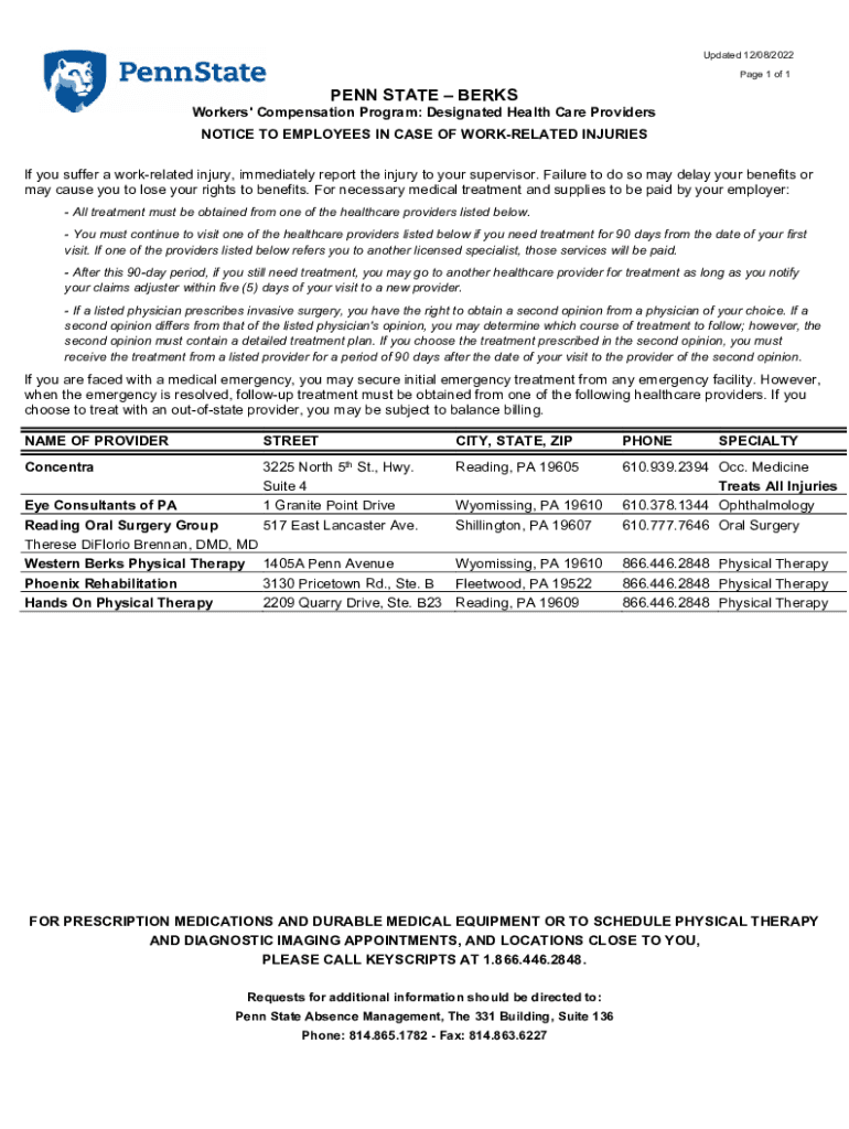 Updated 12/08/2022-Page 1 of 1PENN STATE Berserkers\' Compensation Program: Designated Health Care Providers NOTICE TO EMPLOYEES IN CASE OF CORRELATED INJURIES If you suffer a work related injury,