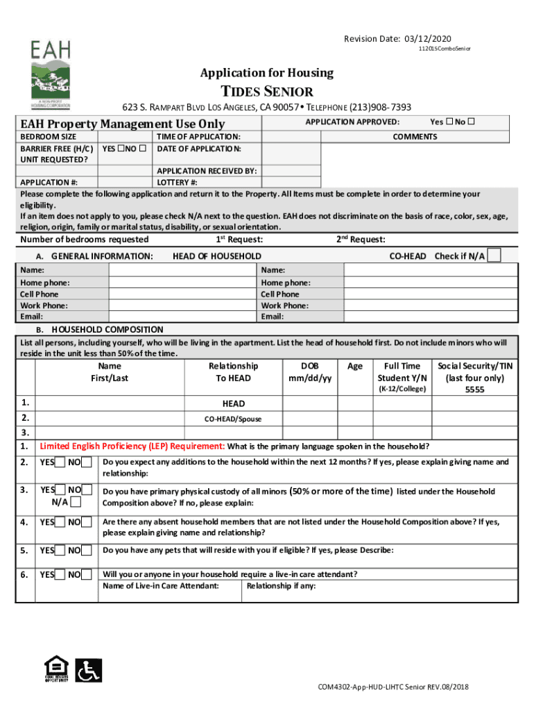 Revision Date: 03/12/2020112015ComboSeniorApplication for HousingTIDES SENIOR623 S. RAMPART BLVD LOS ANGELES, CA 90057 TELEPHONE (213)9087393EAH Property Management Use Only