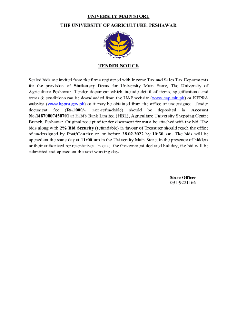 UNIVERSITY MAIN STORE THE UNIVERSITY OF AGRICULTURE, PESHAWARTENDER NOTICE Sealed bids are invited from the firms registered with Income Tax and Sales Tax Departments for the provision of Stationery