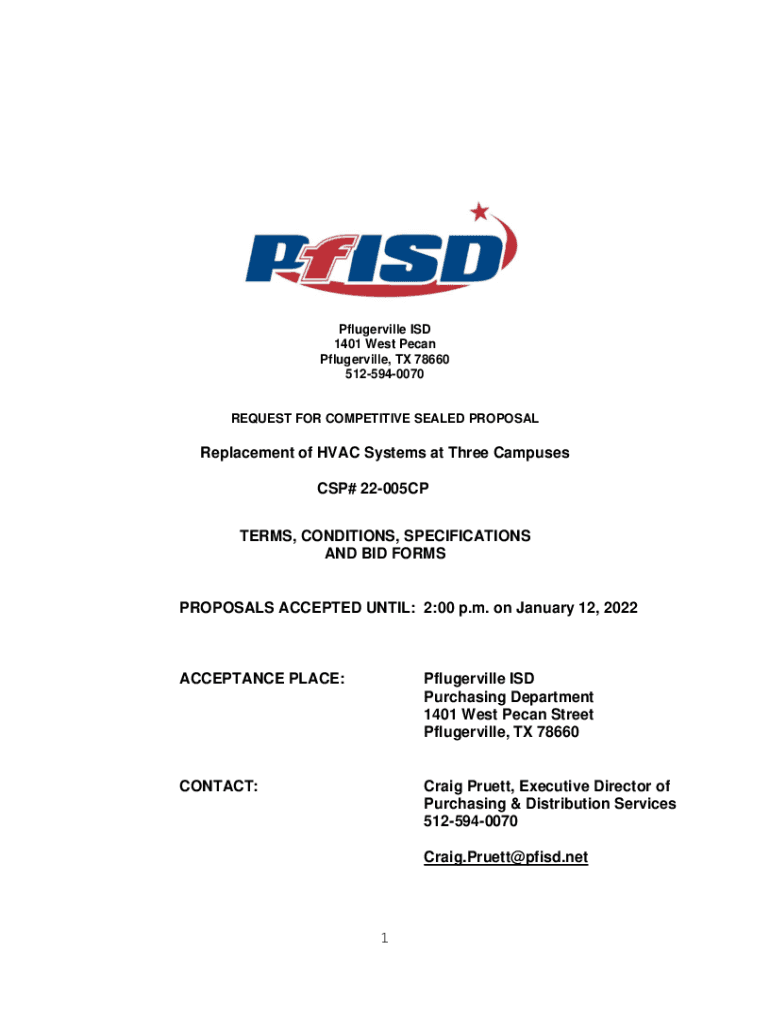 Pflugerville ISD 1401 West Pecan Pflugerville, TX 78660 5125940070REQUEST FOR COMPETITIVE SEALED PROPOSALReplacement of HVAC Systems at Three Campuses CSP# 22005CP TERMS, CONDITIONS, SPECIFICATIONS