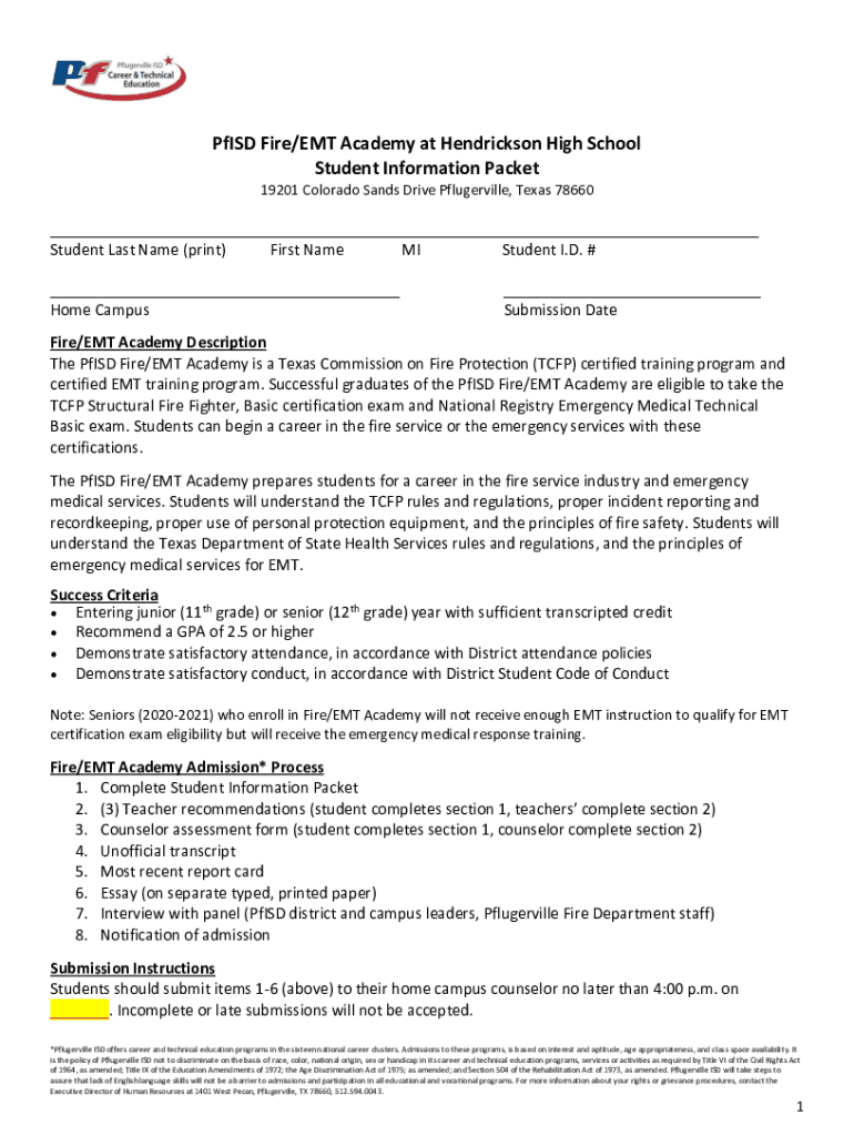 Pf ISD Fire/EMT Academy at Hendrickson High School Student Information Packet 19201 Colorado Sands Drive Pflugerville, Texas 78660___ Student Last Name (print) First Name MI Student I.D. # ___ Home