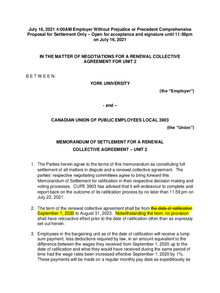 July 16, 2021 4:00AM Employer Without Prejudice or Precedent Comprehensive Proposal for Settlement Only Open for acceptance and signature until 11:59pm on July 16, 2021IN THE MATTER OF NEGOTIATIONS
