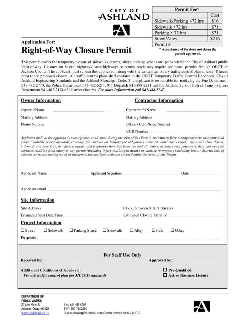 Permit Fee* Sidewalk/Parking 72 hrs Sidewalk 72 hrs Parking 72 hrs Street/Alley Permit #Application For:RightofWay Closure Permits $$$$167171216* Acceptance of fee does not deem the permit approved.