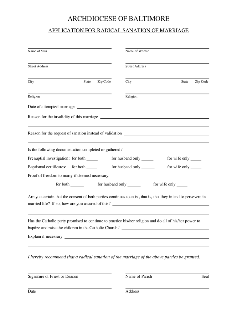 ARCHDIOCESE OF BALTIMORE APPLICATION FOR RADICAL SANCTION OF Marriageable of Manna me of WomanStreet AddressStreet AddressCityStateZip CodeCityReligionStateZip CodeReligionDate of attempted marriage