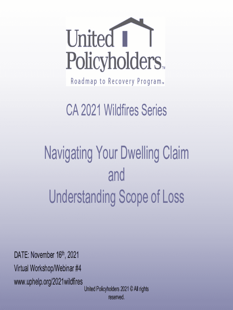 CA 2021 Wildfires SeriesNavigating Your Dwelling Claim and Understanding Scope of Loss DATE: November 16th, 2021 Virtual Workshop/Webinar #4 www.uphelp.org/2021wildfiresUnited Policyholders 2021 All