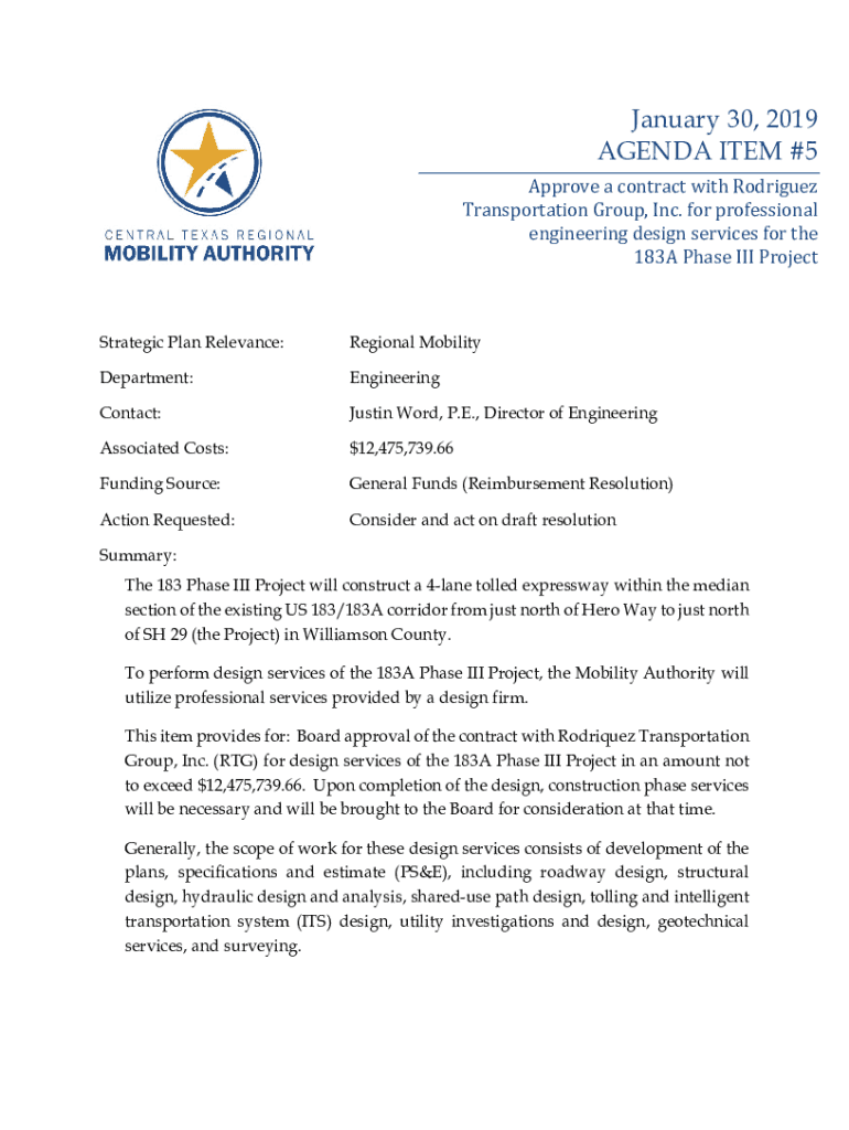 January 30, 2019, AGENDA ITEM #5 Approve a contract with Rodriguez Transportation Group, Inc. for professional engineering design services for the 183A Phase III Project Strategic Plan Relevance:Regional