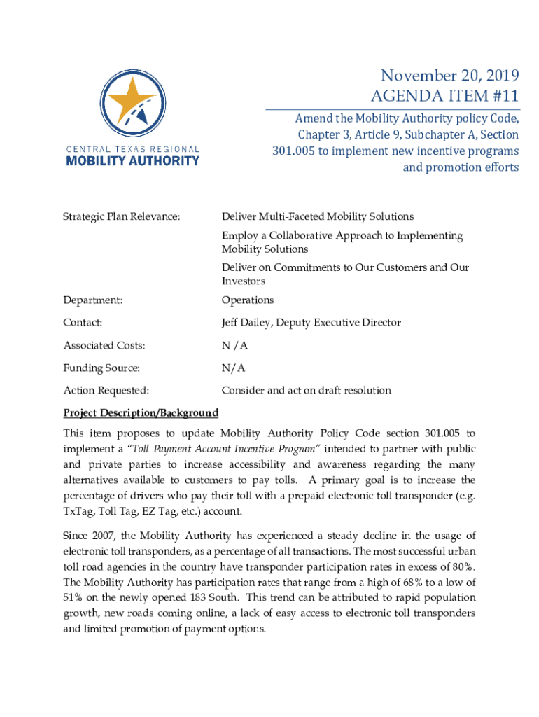 November 20, 2019, AGENDA ITEM #11 Amend the Mobility Authority policy Code, Chapter 3, Article 9, Subchapter A, Section 301.005 to implement new incentive programs and promotion efforts Strategic
