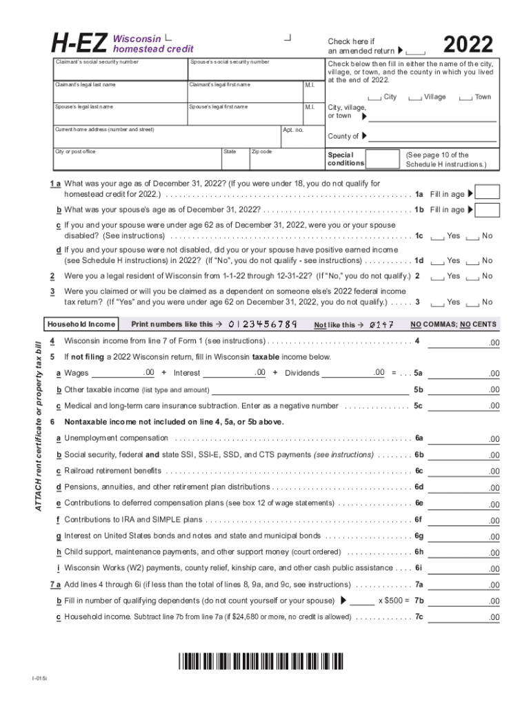 Tab to navigate within form. Use mouse to check applicable boxes, press space bar, or press Enter.HEZSaveWisconsin homestead creditPrint2022Check here if an amended returnClaimants social security