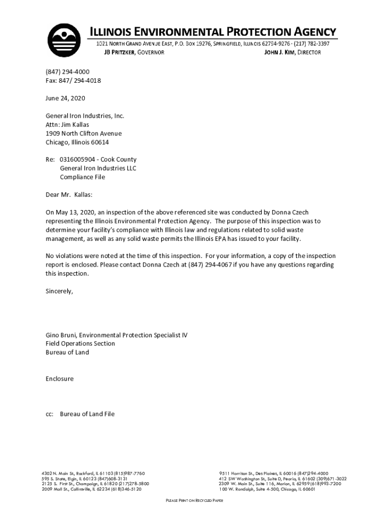 (847) 2944000 Fax:847/2944018 June24,2020 GeneralIronIndustries, Inc. Attn:Impalas 1909NorthCliftonAvenue Chicago,Illinois60614 Re:0316005904CookCounty GeneralIronIndustriesLLC ComplianceFile Dearer.