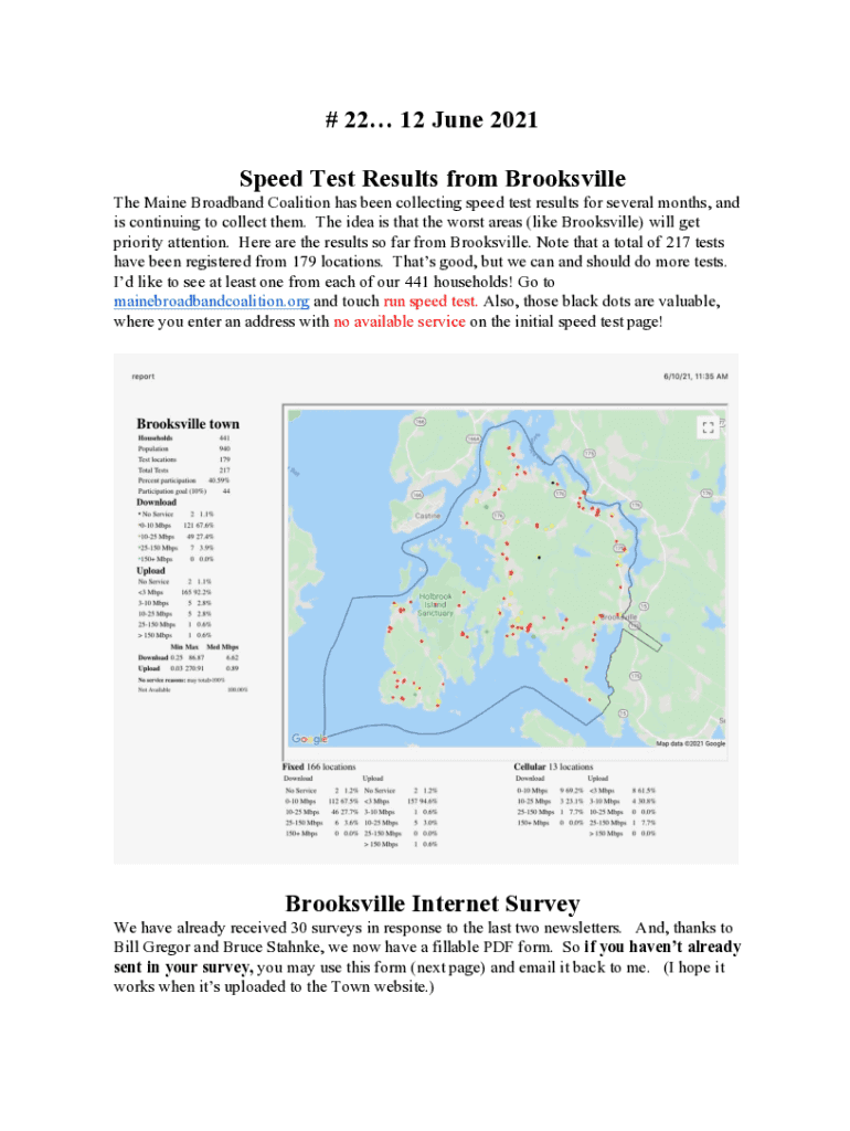 # 22 12 June 2021 Speed Test Results from Brookville The Maine Broadband Coalition has been collecting speed test results for several months, and is continuing to collect them. The idea is that the