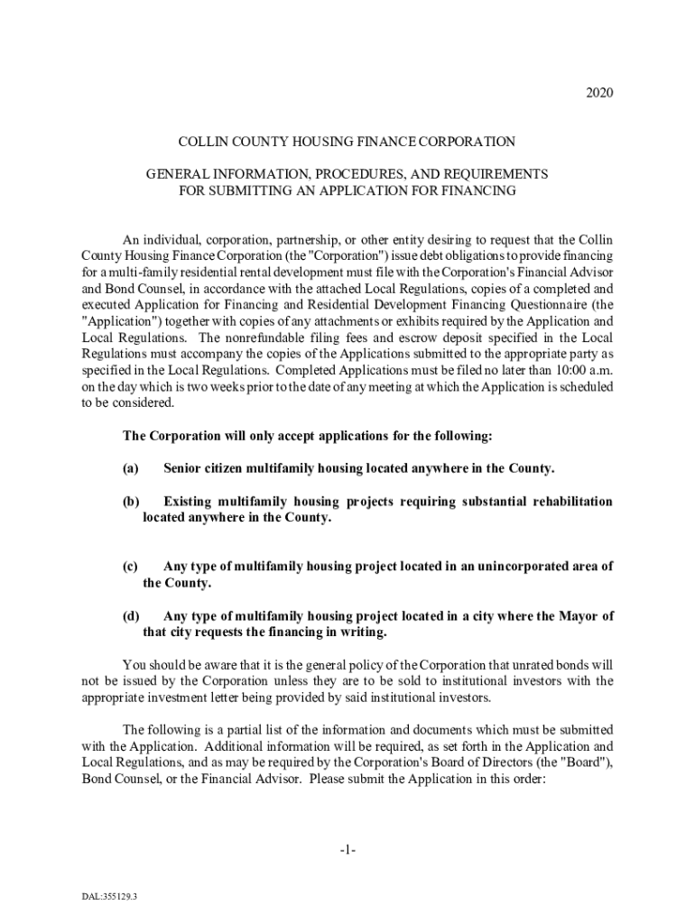 2020 COLLIN COUNTY HOUSING FINANCE CORPORATION GENERAL INFORMATION, PROCEDURES, AND REQUIREMENTS FOR SUBMITTING AN APPLICATION FOR FINANCING An individual, corporation, partnership, or other entity