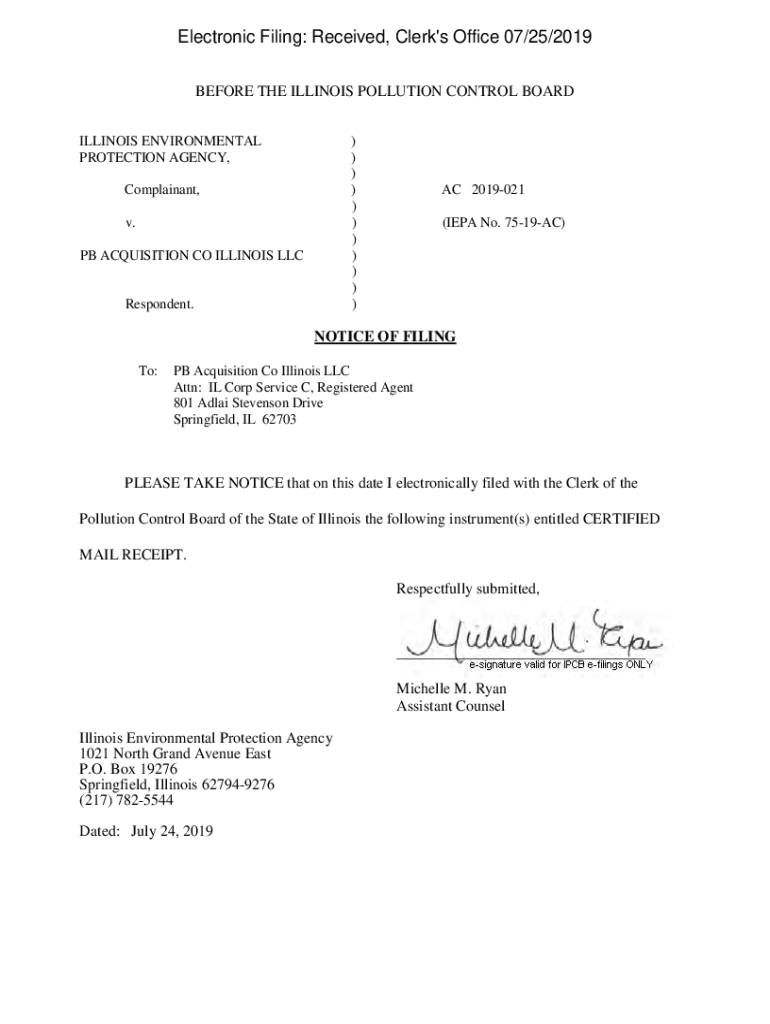 Electronic Filing: Received, Clerk\'s Office 07/25/2019 BEFORE THE ILLINOIS POLLUTION CONTROL BOARD ILLINOIS ENVIRONMENTAL PROTECTION AGENCY, ) ))))))))))Complainant, v. PB ACQUISITION CO ILLINOIS