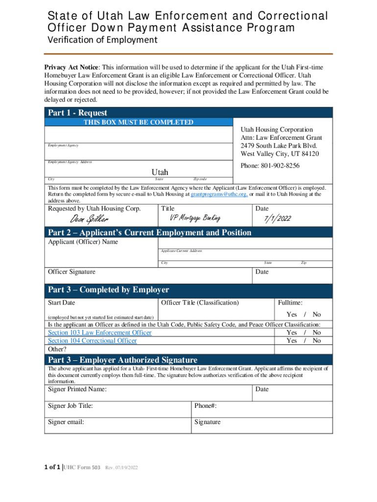 State of Utah Law Enforcement and Correctional Officer Down Payment Assistance Program Verification of Employment Privacy Act Notice: This information will be used to determine if the applicant for