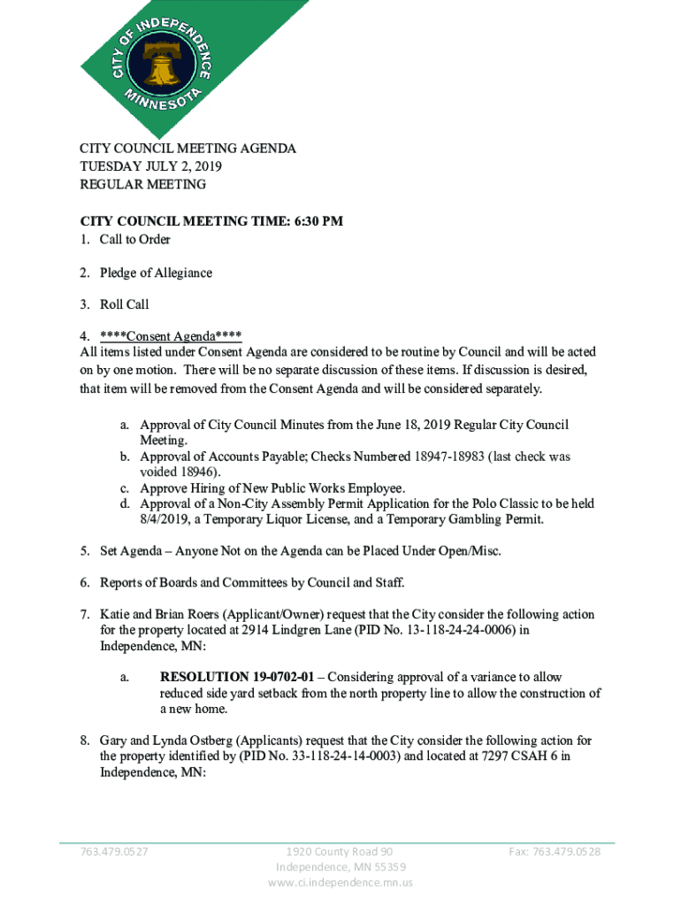 CITY COUNCIL MEETING AGENDA TUESDAY, JULY 2, 2019, REGULAR PERTINACITY COUNCIL MEETING TIME: 6:30 PM 1. Call to Order 2. Pledge of Allegiance 3. Roll Call 4. ****Consent Agenda**** All items listed
