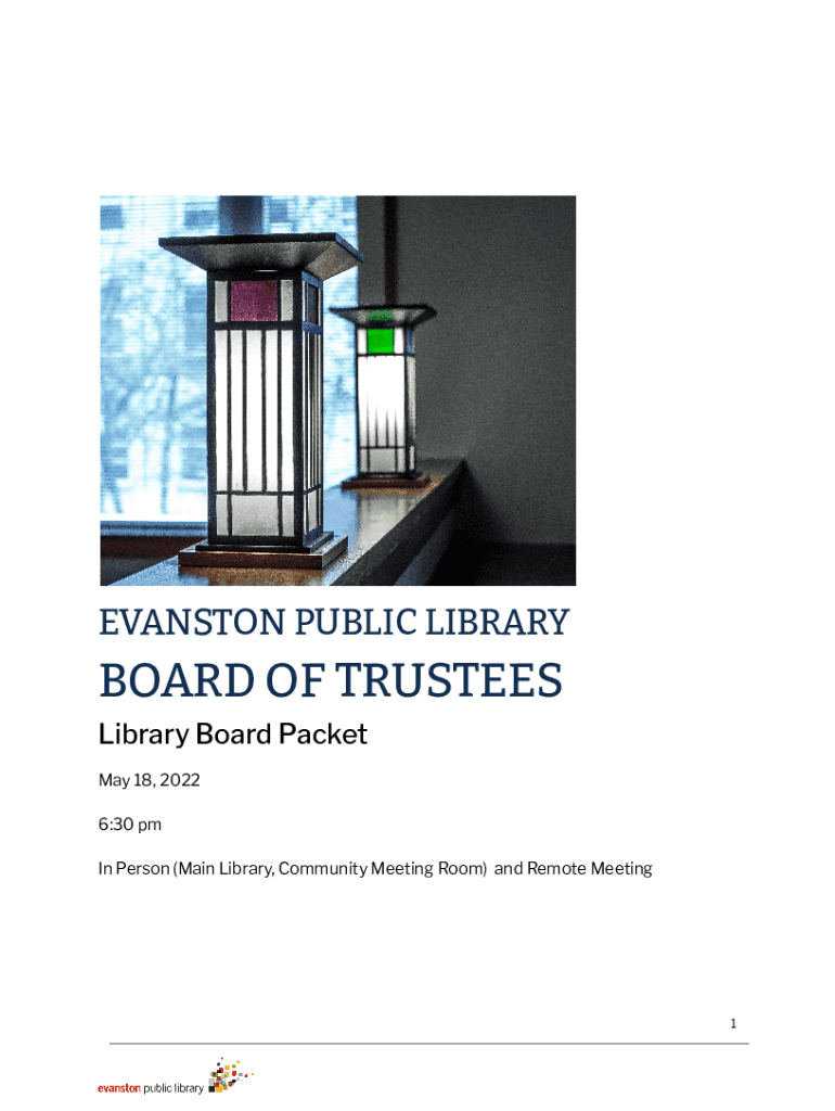 EVANSTON PUBLIC LIBRARYBOARD OF TRUSTEES Library Board Packet May 18, 2022 6:30 pm In Person (Main Library, Community Meeting Room) and Remote Meeting1Remote Access Information The Board of Trustees