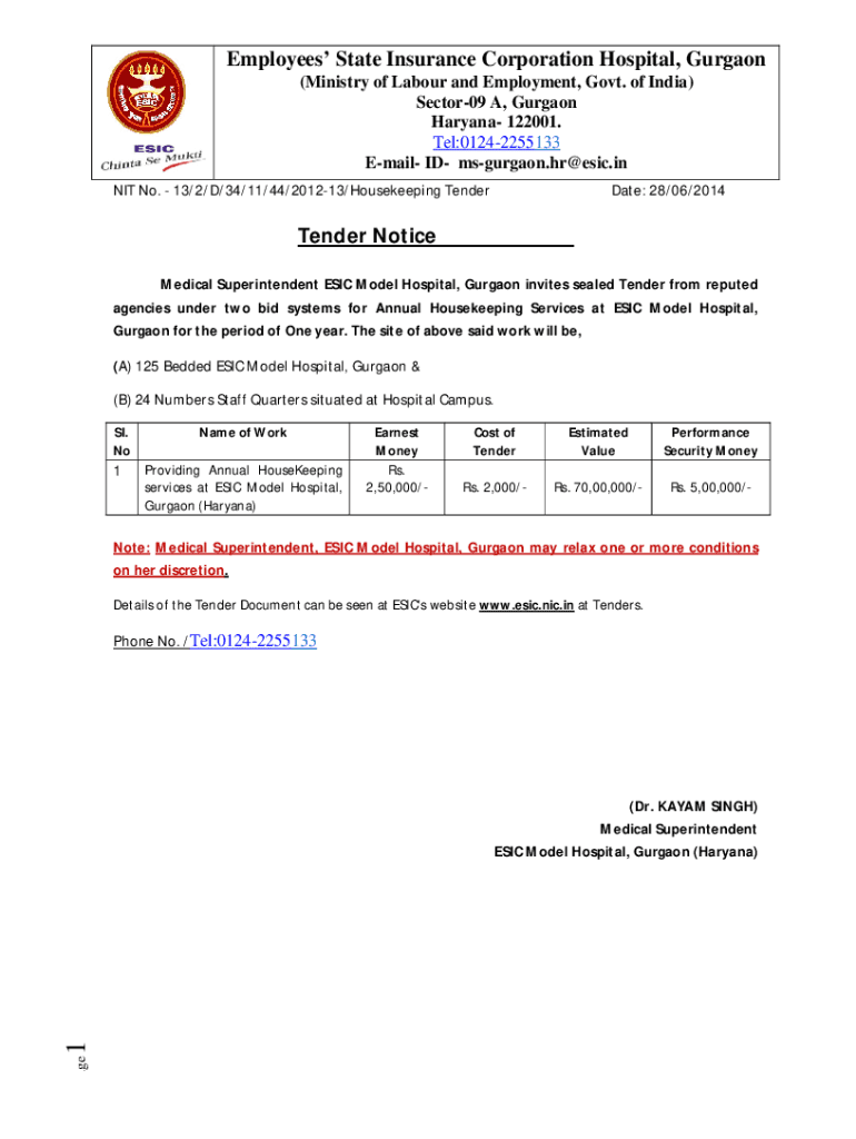 Employees State Insurance Corporation Hospital, Gurgaon (Ministry of Labor and Employment, Govt. of India) Sector09 A, Gurgaon Haryana 122001. Tel:01242255133 Email ID msgurgaon.hr@esic.in NIT No.