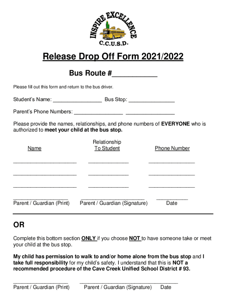 Release Drop Off Form 2021/2022 Bus Route #___ Please fill out this form and return to the bus driver. Students Name: ___ Bus Stop: ___ Parents Phone Numbers: ___ ___ Please provide the names, relationships,