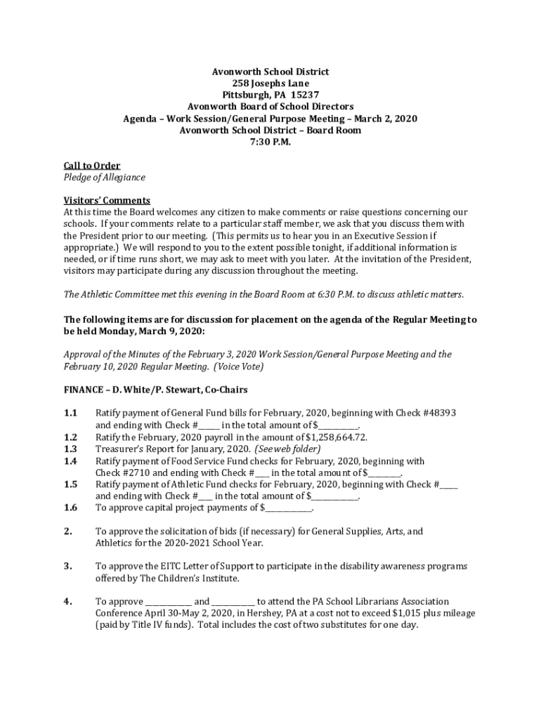 Avon worth School District 258 Josephs Lane Pittsburgh, PA 15237 Avon worth Board of School Directors Agenda Work Session/General Purpose Meeting March 2, 2020, Avon worth School District Board Room