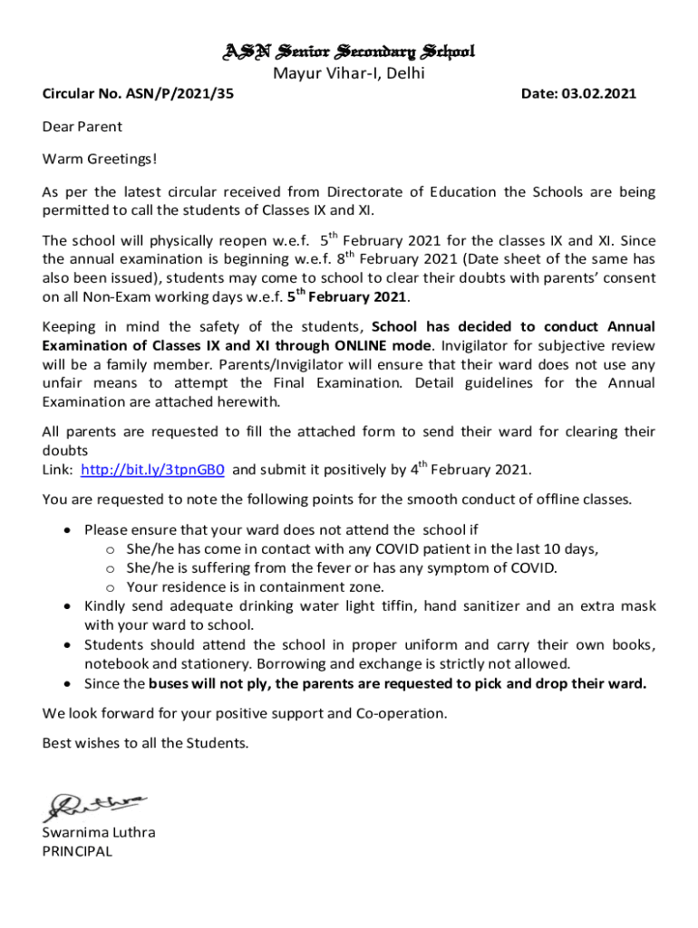 ASN Senior Secondary School Mayor Vicar, Delhi Circular No. ASN/P/2021/35Date: 03.02.2021Dear Parent Warm Greetings! As per the latest circular received from Directorate of Education the Schools are