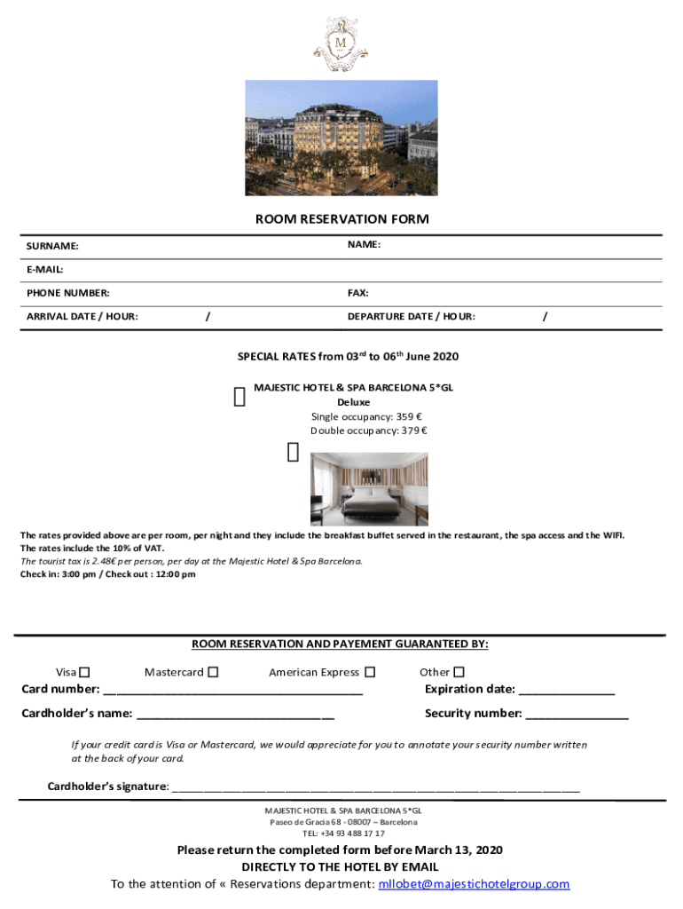 ROOM RESERVATION FORM NAME:SURNAME: EMAIL: PHONE NUMBER:FAX:ARRIVAL DATE / HOUR:/DEPARTURE DATE / HOUR:/SPECIAL RATES from 03rd to 06th June 2020 MAJESTIC HOTEL & SPA BARCELONA 5×GL Deluxe Single
