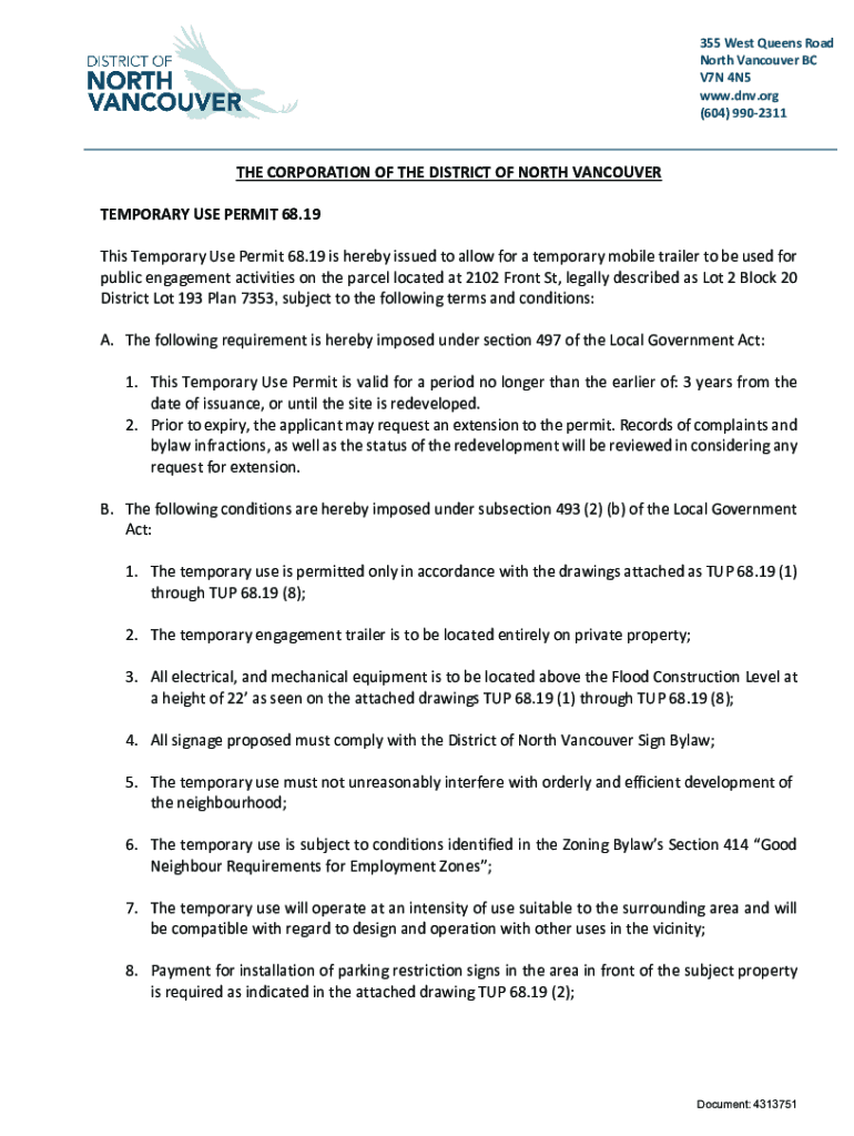 355WestQueensRoad NorthVancouverBC V7N4N5 www.dnv.org (604)9902311THECORPORATIONOFTHEDISTRICTOFNORTHVANCOUVER TEMPORARYUSEPERMIT68.19 ThisTemporaryUsePermit68.19isherebyissuedtoallowforatemporarymobiletrailertobeusedfor