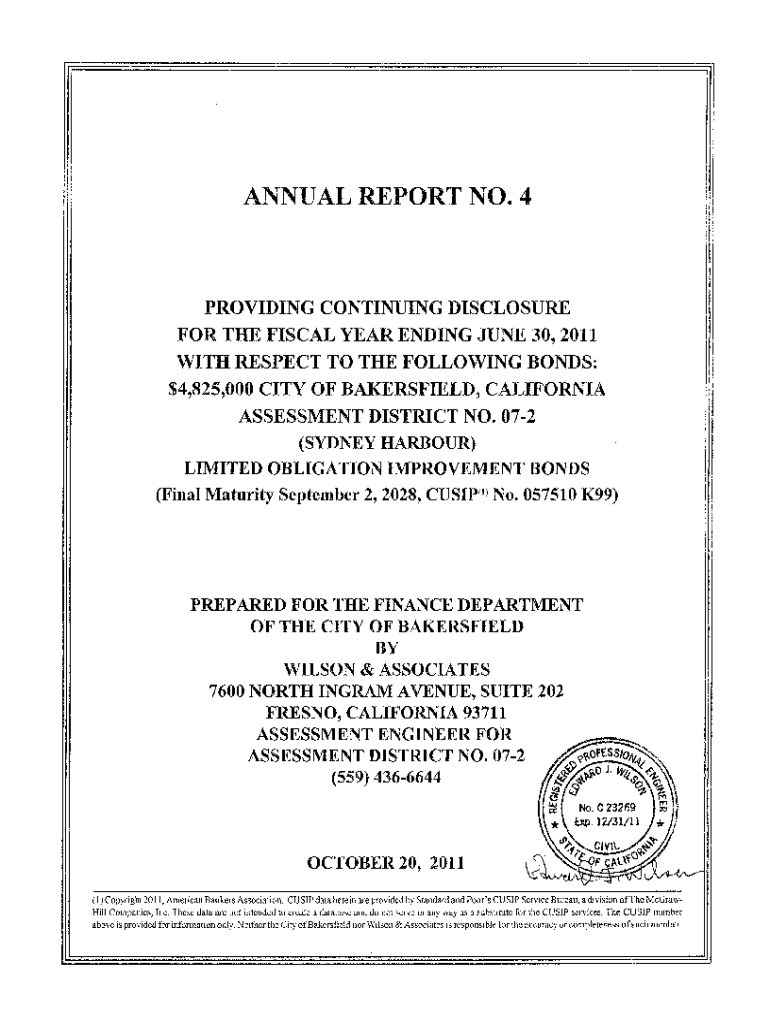 ANNUAL REPORT NO. 4PROVIDING CONTINUING DISCLOSURE FOR THE FISCAL YEAR ENDING JUNE 30, 2011, WITH RESPECT TO THE FOLLOWING BONDS: $4,825,000 CITY OF BAKERSFIELD, CALIFORNIA ASSESSMENT DISTRICT NO.