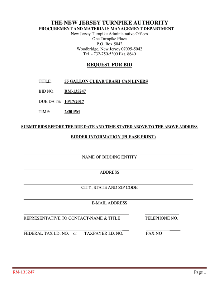 THE NEW JERSEY TURNPIKE AUTHORITY PROCUREMENT AND MATERIALS MANAGEMENT DEPARTMENT New Jersey Turnpike Administrative Offices One Turnpike Plaza P.O. Box 5042 Woodbridge, New Jersey 070955042 Tel.