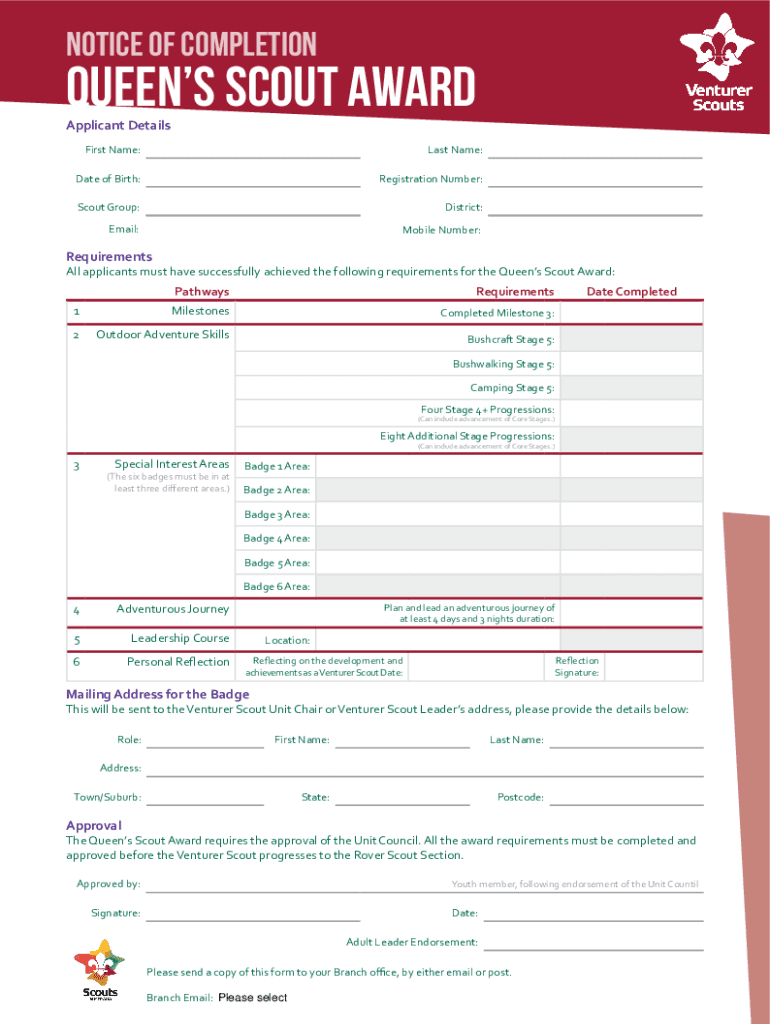 Get the free Notice of Completion - Queen's Scout Award - Scouts Victoria