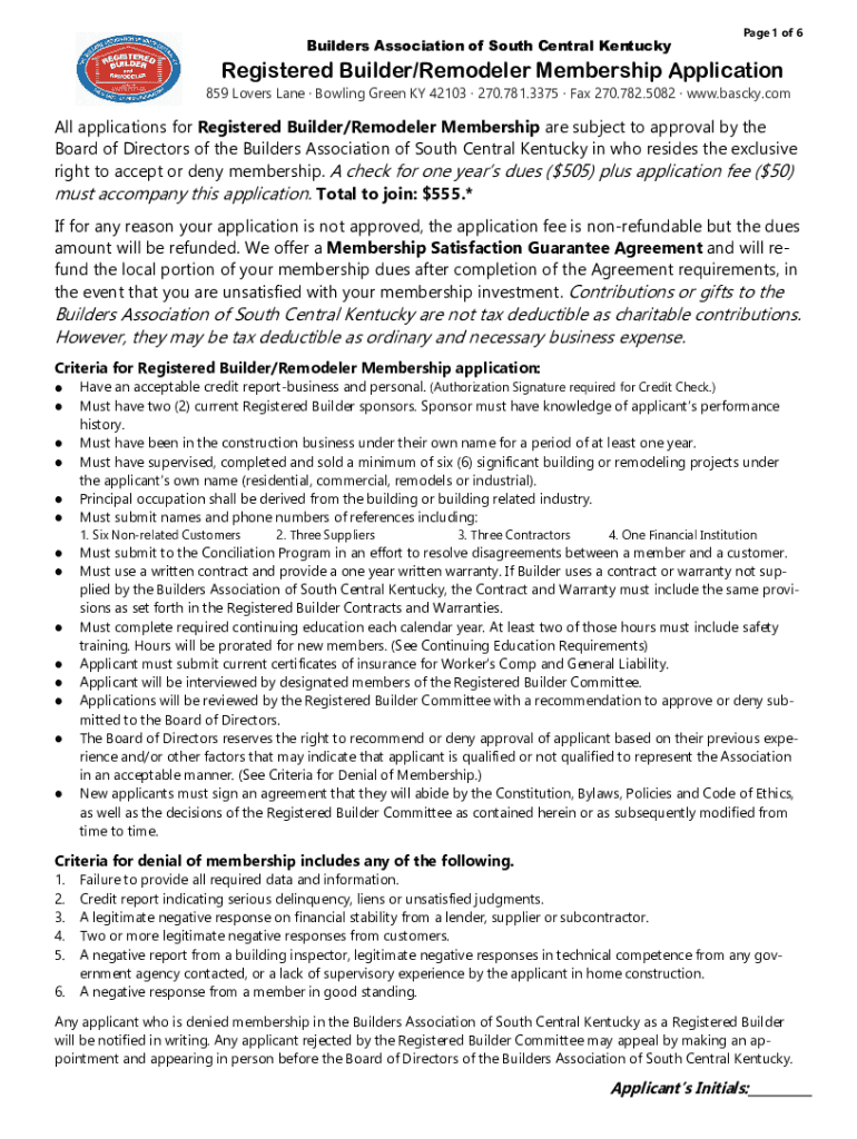 Builders Association of South Central Kentucky Page 1 of 6Registered Builder/Remodeled Membership Application 859 Lovers Lane Bowling Green KY 42103 270.781.3375 Fax 270.782.5082 www.bascky.comAll