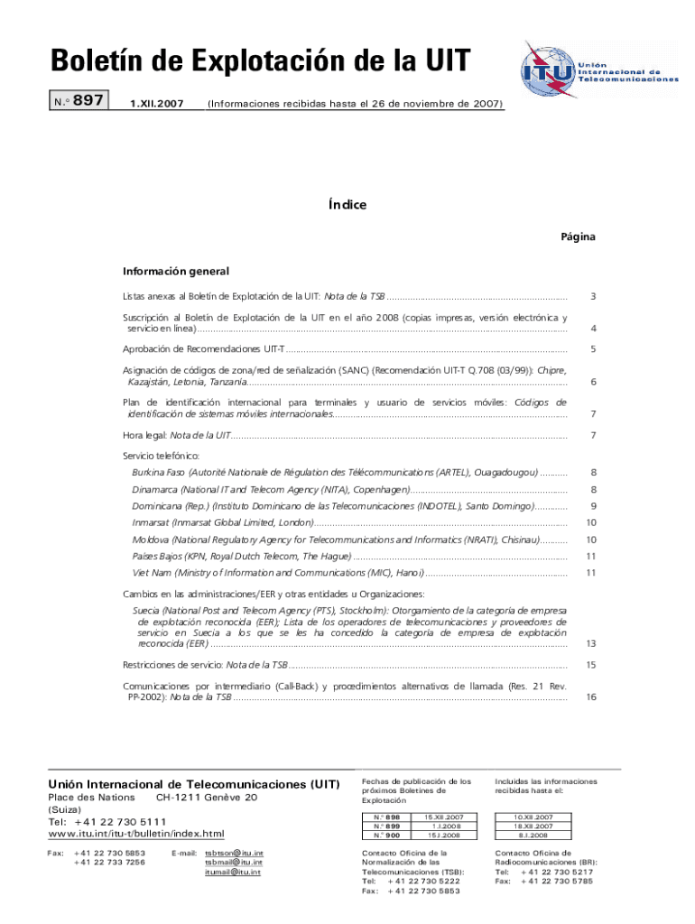 Boleyn de Explotacin de la UIT N.o8971.XII.2007(Information regicides pasta El 26 de November de 2007)nice Gina Information general Lists Alexas all Boleyn de Explotacin de la UIT: Not DE la TSB ......................................................................3Suscripcin