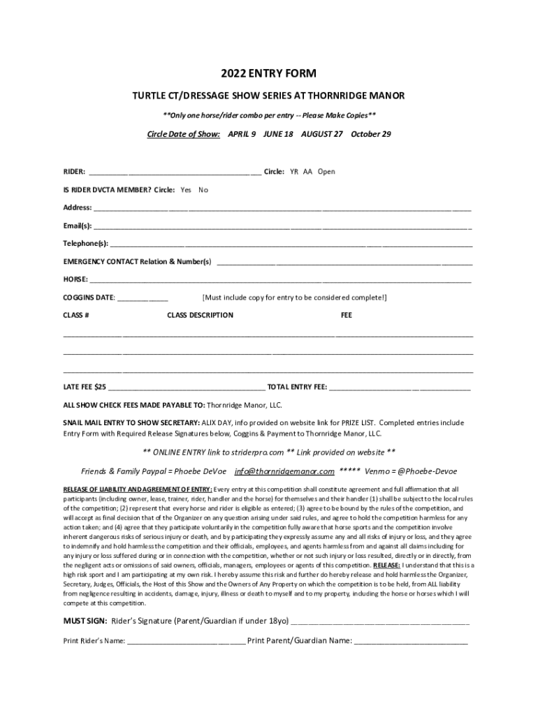 2022 ENTRY FORM TURTLE CT/DRESSAGE SHOW SERIES AT OATMEAL MANOR **Only one horse/rider combo per entry Please Make Copies**Circle Date of Show: APRIL 9 JUNE 18 AUGUST 27 October 29RIDER: ___ Circle: