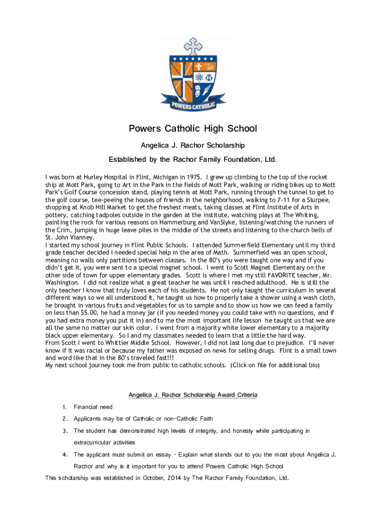 Powers Catholic High School Angelica J. Rather Scholarship Established by the Rather Family Foundation, Ltd. I was born at Hurley Hospital in Flint, Michigan in 1975. I grew up climbing to the top